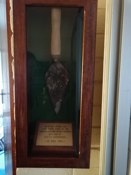 During the service, the Woman's Auxiliary branch president, Mrs. Anne Grobler presented Rev. James Ramage with the trowel that had been used to lay the foundation stone. It had been presented to the representatives of the Phalaborwa Society at the (then recent) District W.A. meetings held in (then Pietersburg) by Mrs. Jenny Sprong who was the W.A. president of the then South Eastern Transvaal and Swaziland District, and wife of the Methodist minister in Brackenhurst, Alberton.